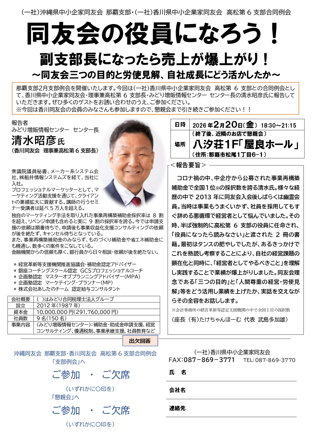 2026/02/20 (金) 18:30~ 2月度高松第6支部&沖縄同友会・那覇支部 合同例会