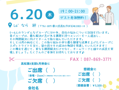 2024/06/20 (木) 19:00~自社の悩みをチームで解決しよう!!~8支部の結束を深める。知り合いから仲間へ。~
