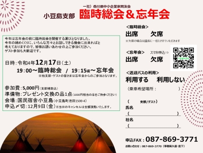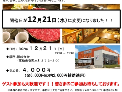 - ◎日時:令和4年12月17日(土) 19:00~臨時総会 / 19:15頃~忘年会