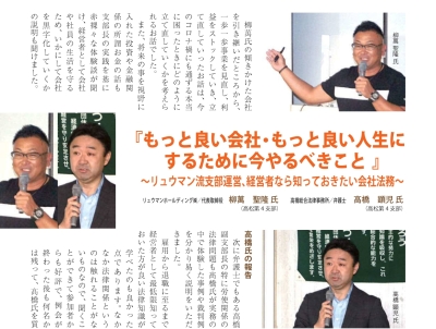 もっと良い会社・もっと良い人生にするために今やるべきこと~リュウマン流支部運営、経営者なら知っておきたい会社法務~/リュウマンホールディング(株) 代表取締役 柳萬聖隆氏・高橋総合法律事務所 弁護士 高橋顕児氏(高松第4支部)
