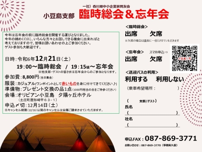 2024/12/21 (土) 19:00~ 小豆島支部臨時総会&忘年会