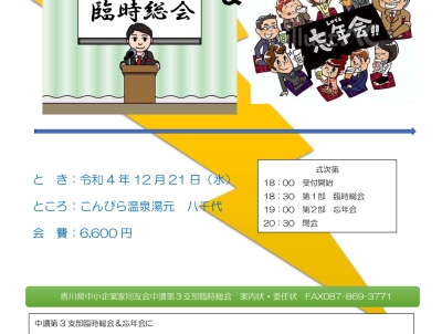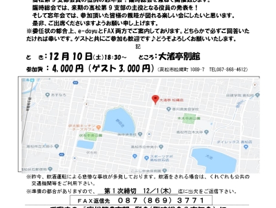 - ◎日時:令和4年12月17日(土) 19:00~臨時総会 / 19:15頃~忘年会