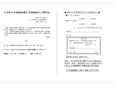2024/04/26 (金) 19:00~ 令和4年度高松第5支部総会のご案内