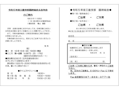 2024/12/10 (火) 19:00~ 12月度三豊支部例会<臨時総会・忘年会>