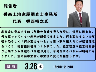 2025/03/26 (水) 19:00~創る会に参加し進むべき道が見えました!~軸のないがむしゃら経営からの脱却~