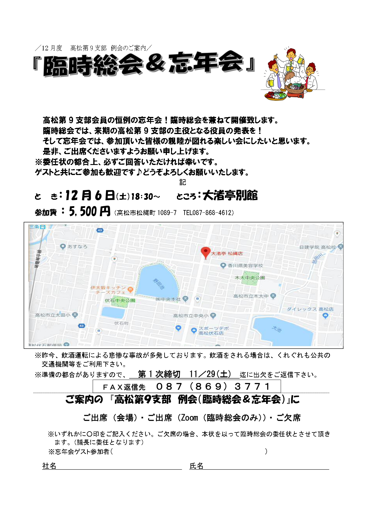 高松第9支部会員の恒例の忘年会!臨時総会を兼ねて開催致します。