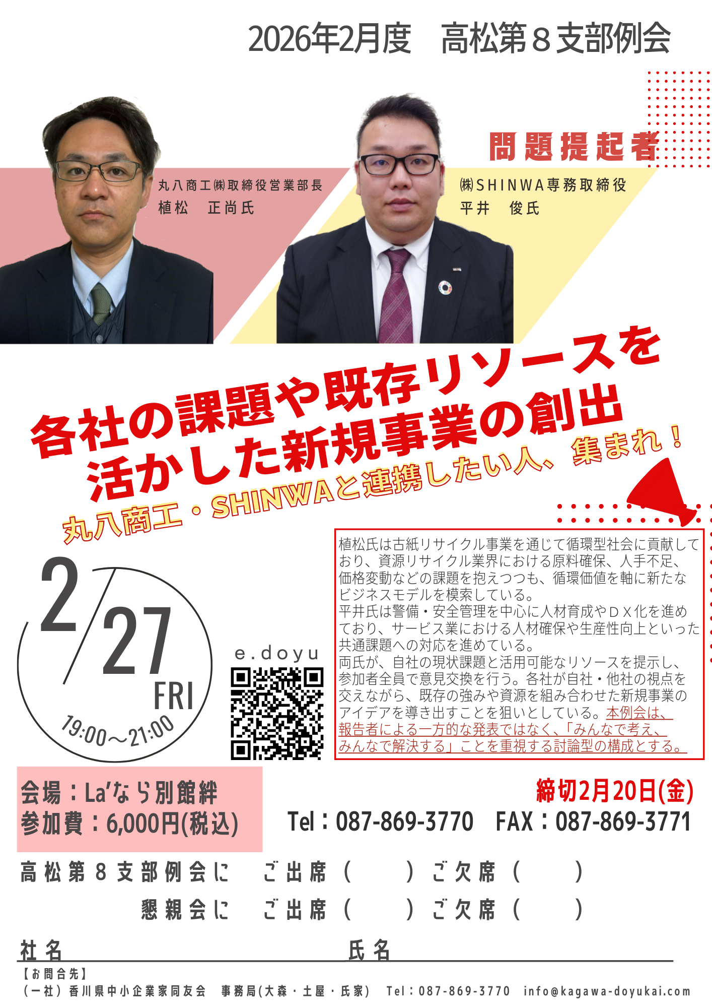 両氏が、自社の現状課題と活用可能なリソースを提示し、参加者全員で意見交換を行う。各社が自社・他社の視点を交えながら、既存の強みや資源を組み合わせた新規事業のアイデアを導き出すことを狙いとしている。本例会は、報告者による一方的な発表ではなく、「みんなで考え、みんなで解決する」ことを重視する討論型の構成とする。