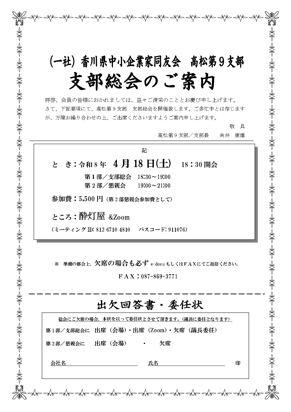 さて、下記要項にて、高松第9支部 支部総会を開催致します。ご多忙中とは存じますが、万障お繰り合わせの上、ご出席くださいますようご案内申し上げます。