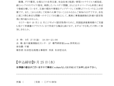 2024/09/27 (金) 18:30~ BCPセミナ-2024:ジギョケイ(事業継続力強化計画)もBCPも更新が大切です ~危機の形も新しくなっています。対策もリファインしましょう~
